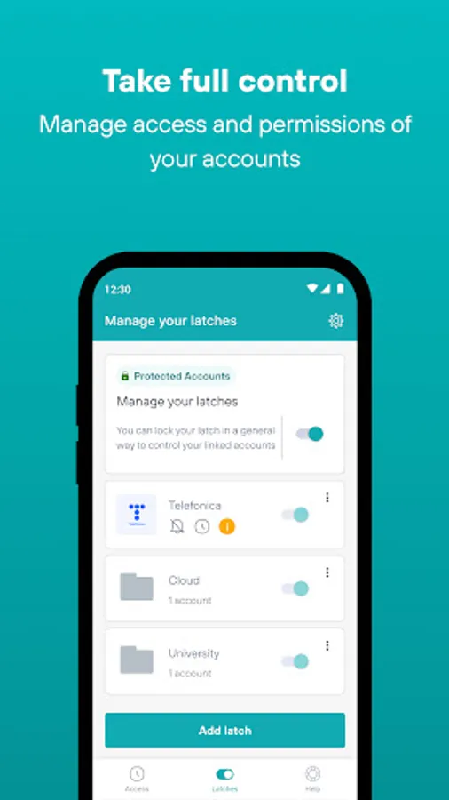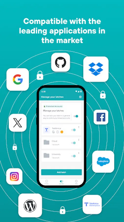 Latch allows additional authorization management through self-managed locks, as well as a second TOTP authentication factor. The Latch alert system allows you to identify, in real-time, suspicious behaviors in your accounts.