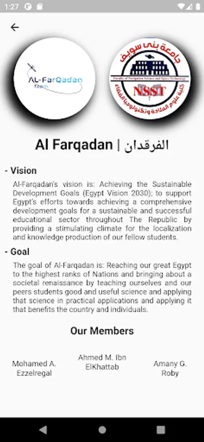 Al Farqadan app is a minimalist app for anyone who wants to learn Space Sciences. Made by Al Farqadan team from NSST - BSU ( Faculty of Navigation Sciences and Space Technology - Beni Suef University ), a group of 9 Sophomore students who are passionate about help everybody to learn more about their studies in the first of its kind college in this field in Egypt & MENA region.