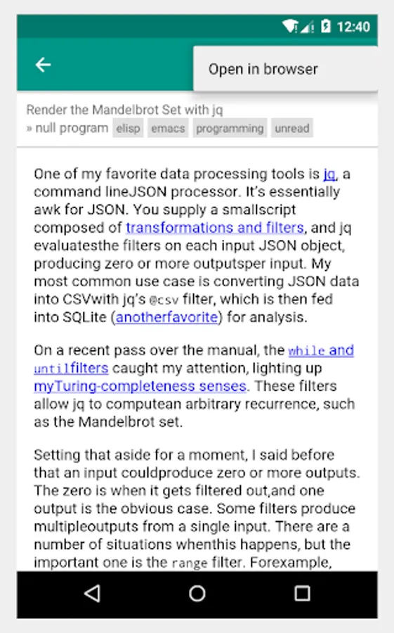 Emacs. The app connects remotely to Elfeed web API and it gets the feeds content