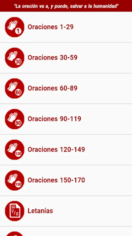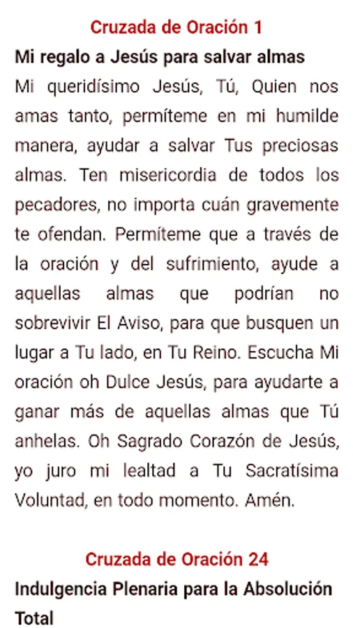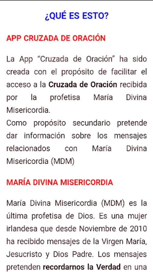 This APP contains all the prayers in Spanish (South America) of the Prayer Crusade that God has given to Mary Divine Mercy. The sentences have been divided into groups. It includes some fragments of the messages received in connection with these prayers.