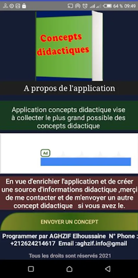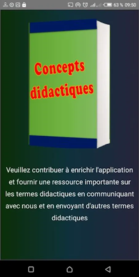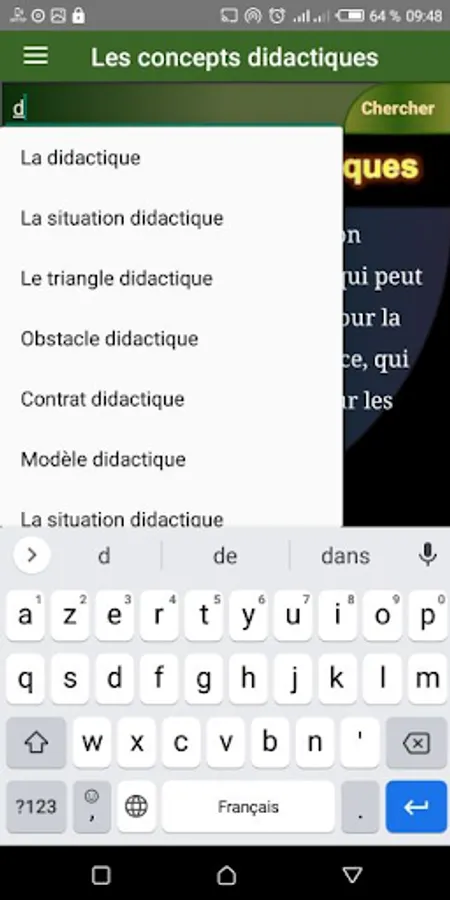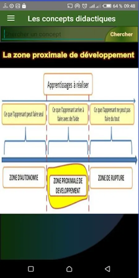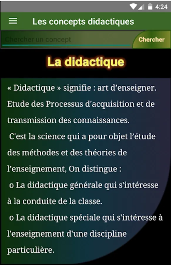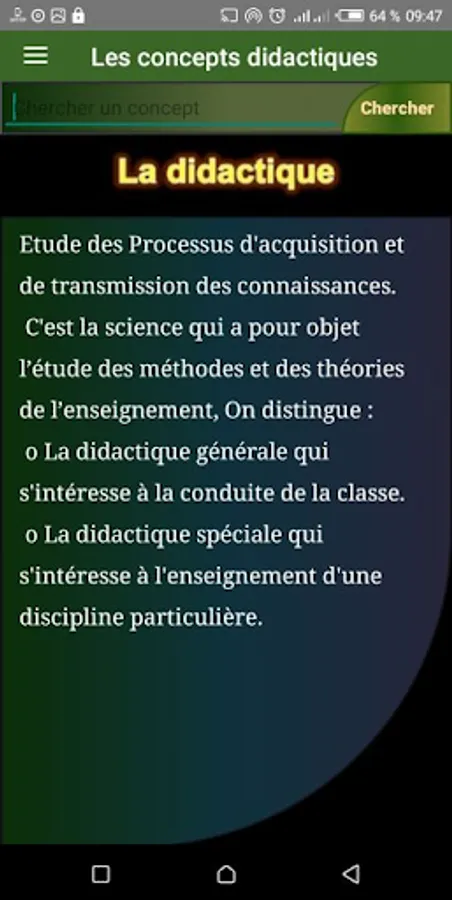 The didactics of a discipline study the processes of acquisition and transmission relating to the specific field of that discipline. It must make the taught knowledge a living, functional and operational knowledge, in this application we deal with a set of didactic concepts such as the didactic variable and didactic transposition, the didactic triangle and other terms.