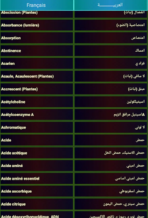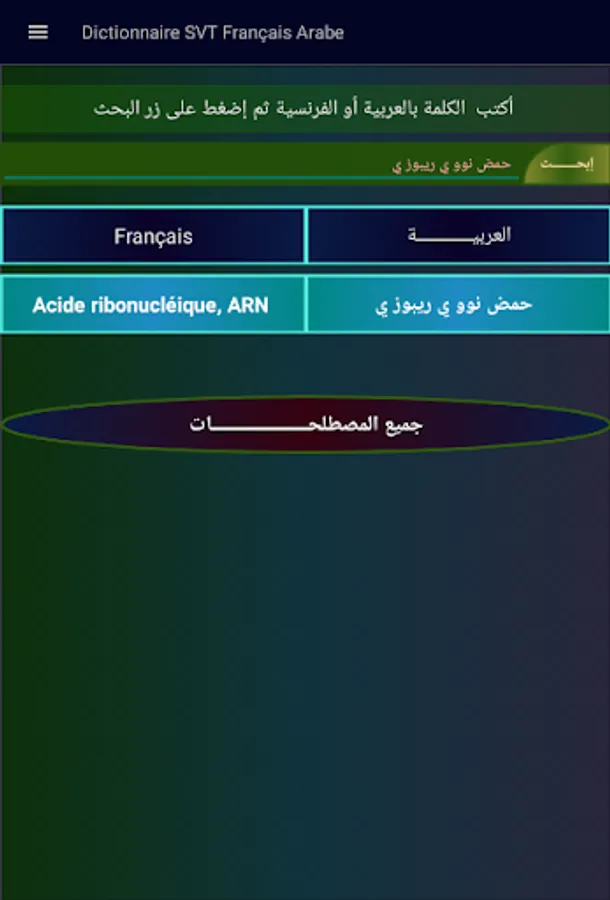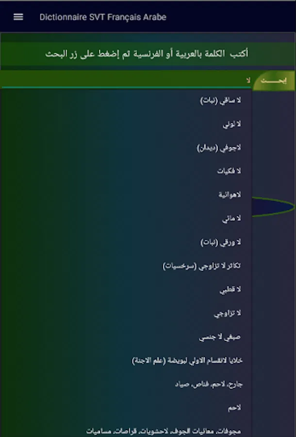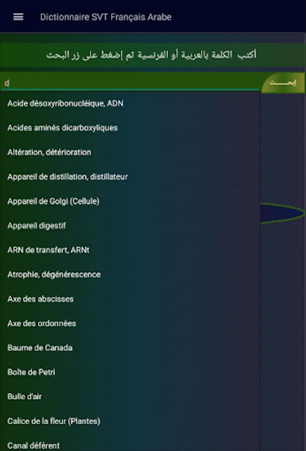 An application that contains the terms of life and earth sciences, a double Arabic-French and French-Arabic for all students to facilitate the understanding of life and Earth sciences and to overcome the obstacle of the French language