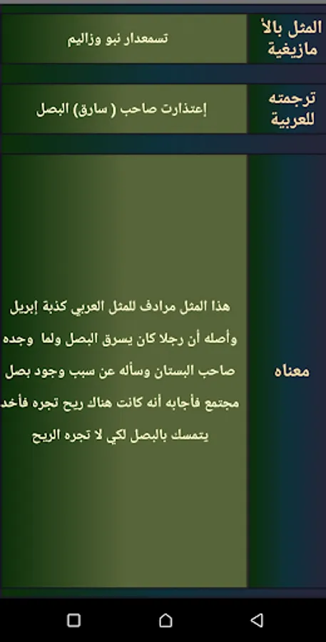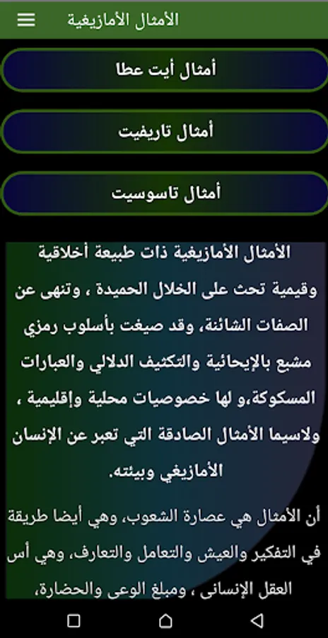The application of Amazigh proverbs is an application that aims to collect the largest number of proverbs to revive the Amazigh heritage, to ensure the continuity of the Amazigh cultural heritage and to spread our Amazigh culture.