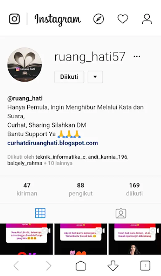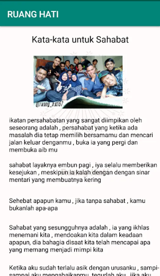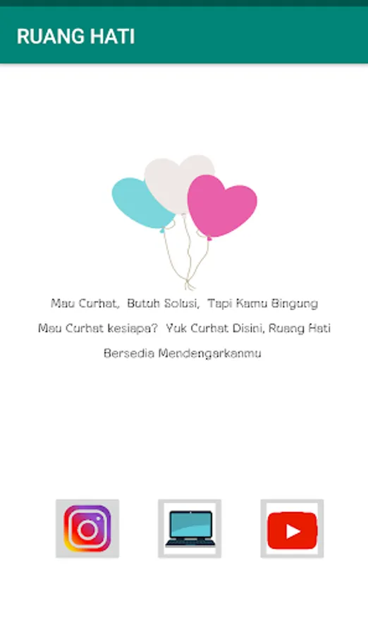 Space Heart, Provides several words, both words about Sahabt, girlfriend, sad and so forth, Here There are also links that we provide For those of you who want to share stories / confide. We also provide Instagram, and our official YouTube links, if you want to see the words, video illustrations. please visit our official accounts, we will faithfully listen to you, you can recommend, words in the form of pictures, sounds or videos, help support ya