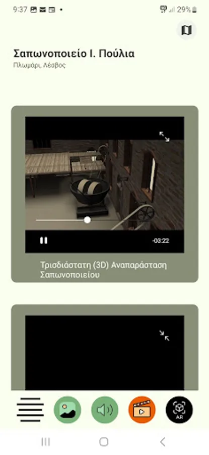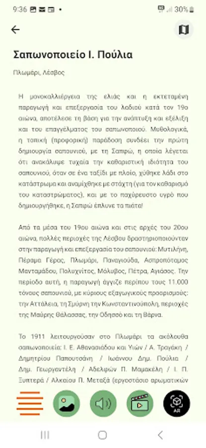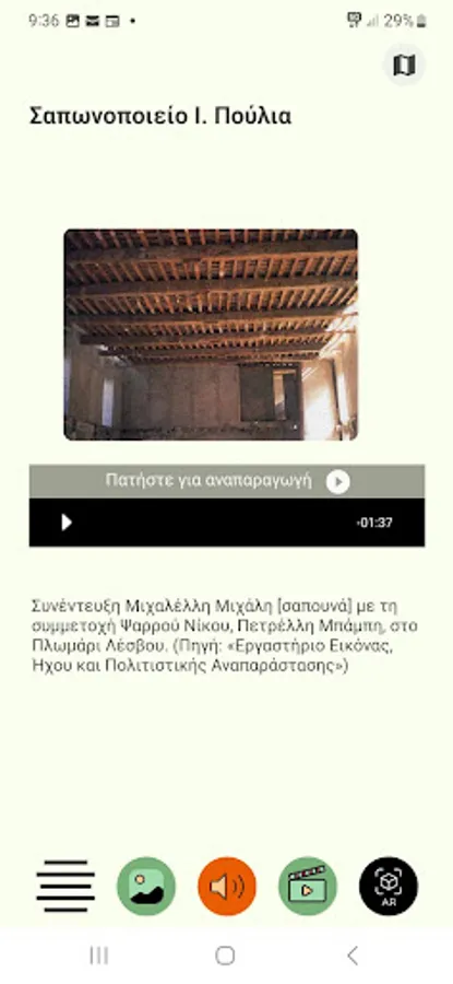 The application for mobile devices was created in the framework of the Project: "OLIVE: A representation of the age-old olive oil production techniques in Lesbos, using Virtual Reality and Augmented Reality technologies".