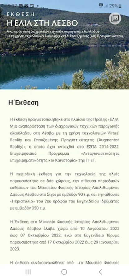The project includes both the creation of an exhibition space for Elia with Virtual Reality technologies and the implementation of digital applications for the presentation and promotion of Elia in Lesbos.