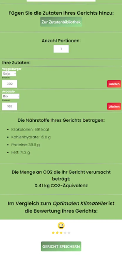 In recent years, the word sustainability has been on everyone's lips. An important aspect of this sustainability is our ecological footprint and the way we eat. The "Climate Calculator: Nutrition" app makes it possible to set an emission target and to measure how well this is being achieved by constantly recording the dishes consumed. The app shows how much CO2 is emitted. All entered dishes are compared and evaluated with an optimal plate.