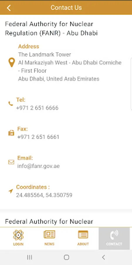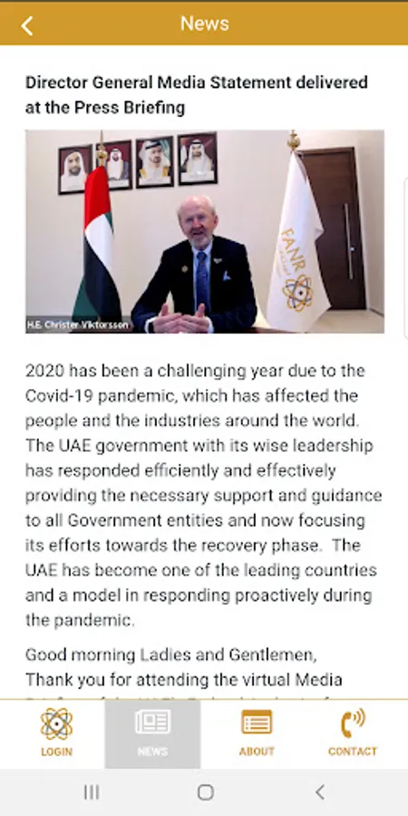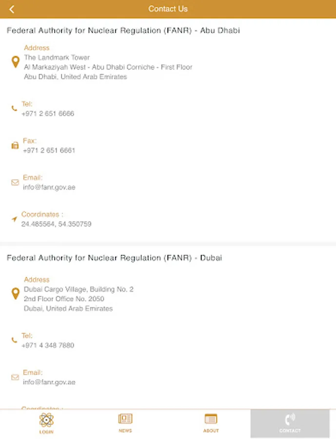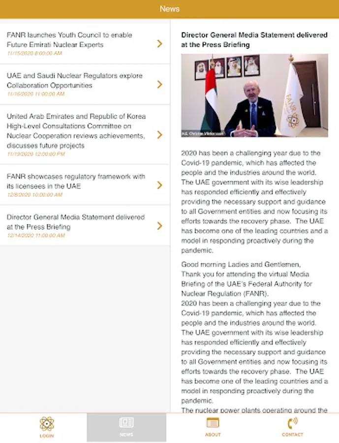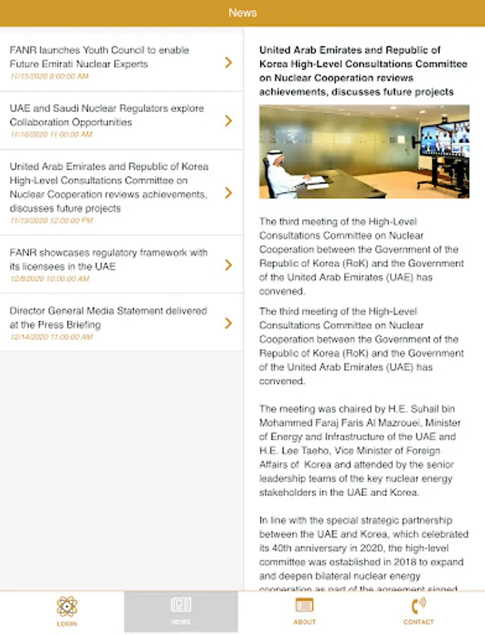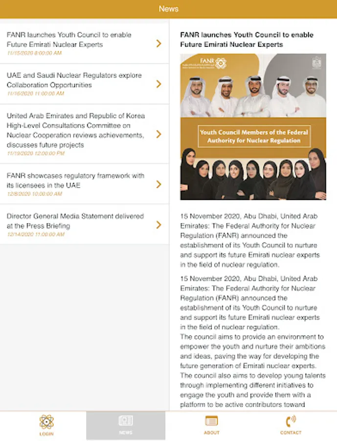 The app provides general information and news about FANR and quick access to its smart services, location and contact information.