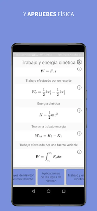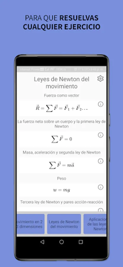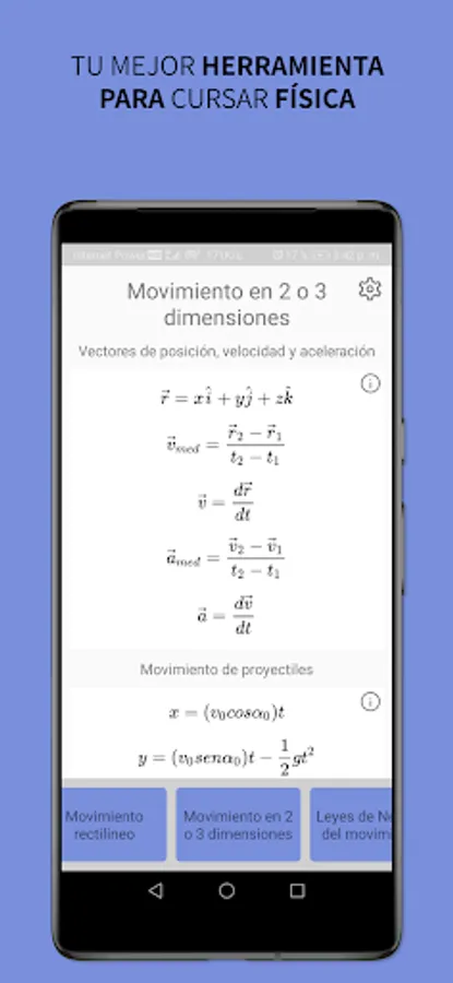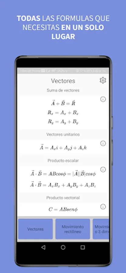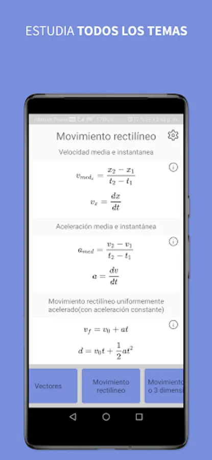 In this app you will find the necessary formulas to solve exercises of any of the topics mentioned above, all the formulas are organized according to the topic to which they belong and the navigation between one topic and another is simple and fast.