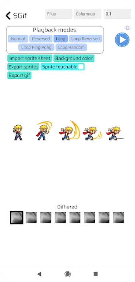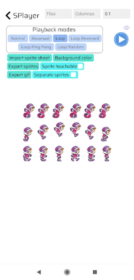 Also, you can export the sprites as separate images. Once you have opened the sprite sheet and specified the number of rows and columns, simply select the "Separate sprites" button to split them, and then press "Export sprites" to save them as individual files.