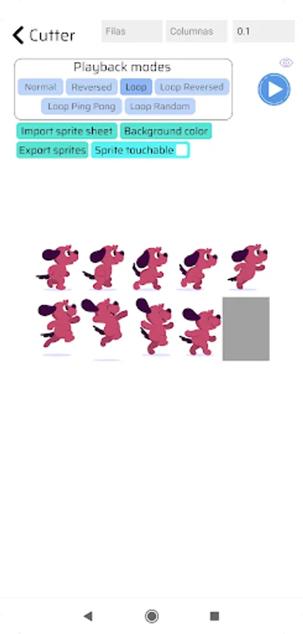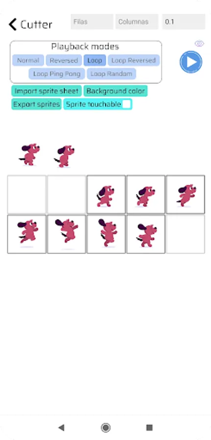 To test a sprite sheet, import the sprite sheet you want to test and specify the number of rows and columns the sprite sheet has, then press the play button.