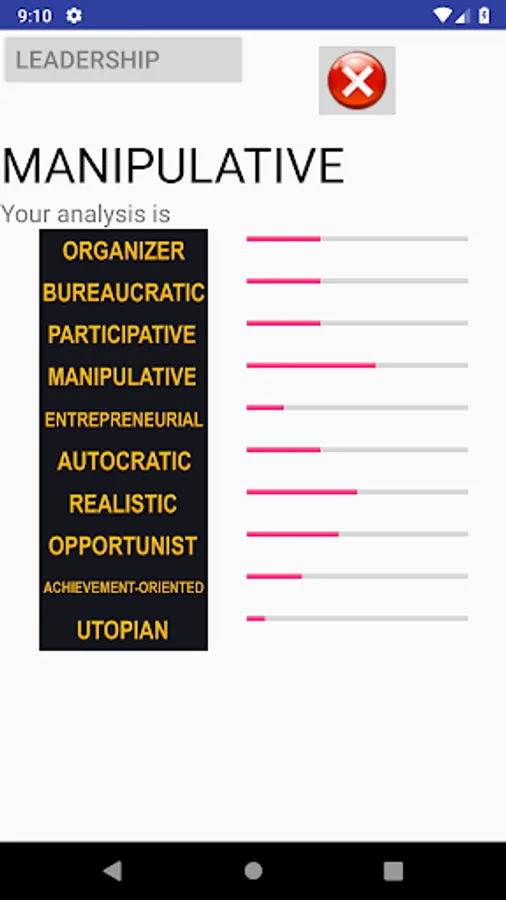 Organizer, Bureaucratic, Participative, Manipulative, Entrepreneurial, Autocratic, Realistic, Opportunist, Achievement oriented, Utopian.