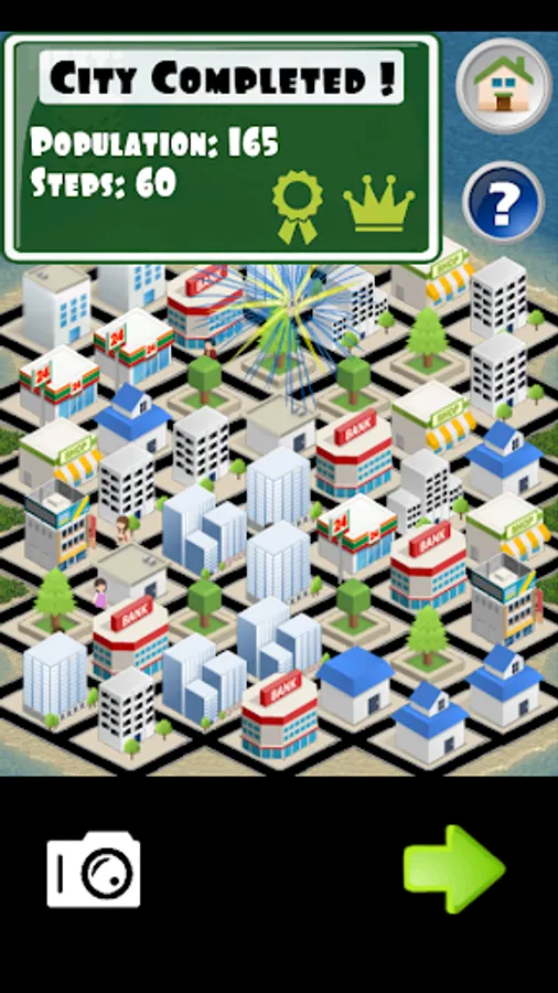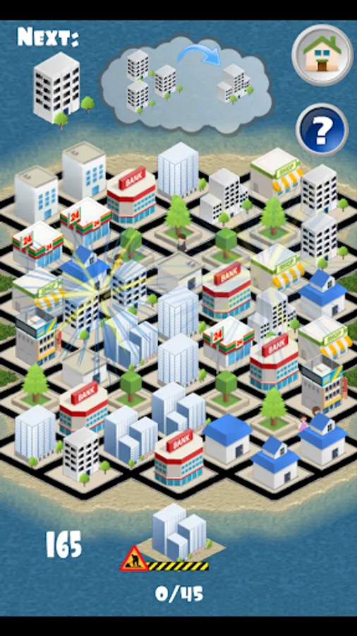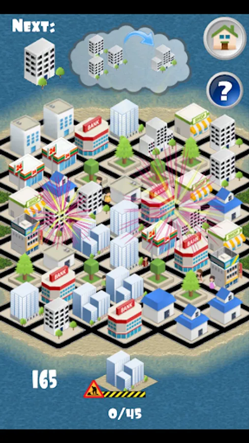 By matching three or more of same buildings in adjacent cells, it will turn into a new building with higher level. The game ends when your city filled all available plots of the island.