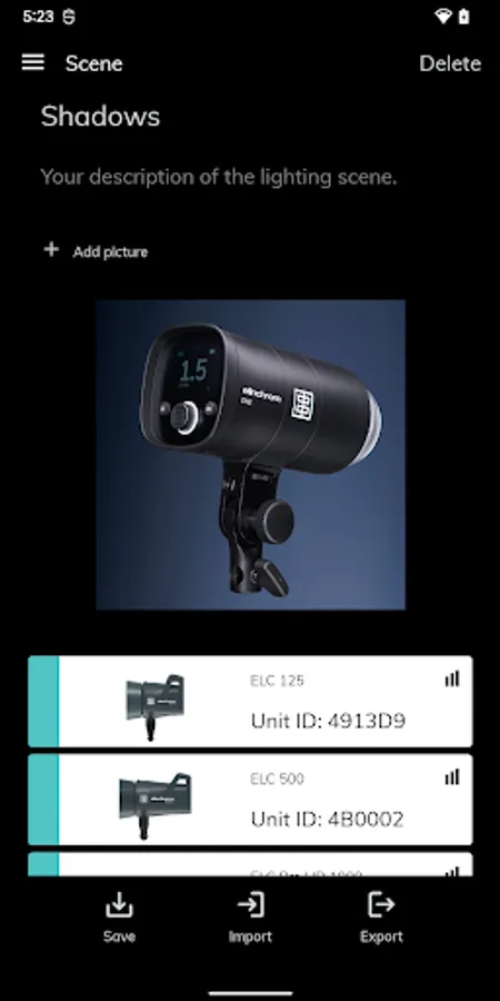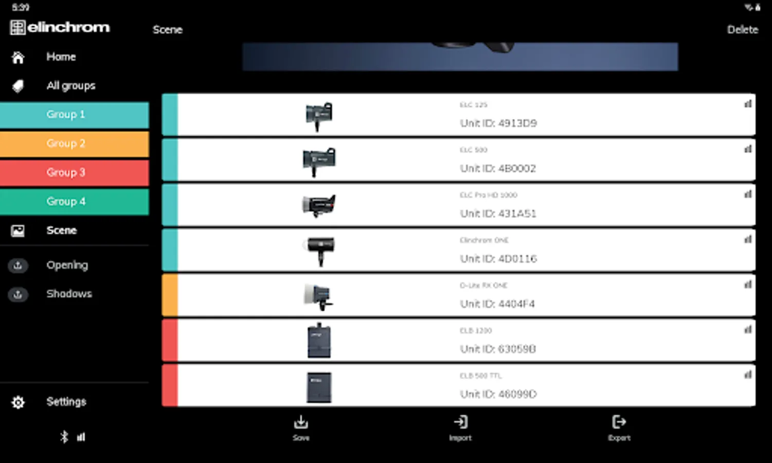 Keep an overview of your lighting setup from your phone or tablet and quickly access each units’ most important settings even when they are out of reach. Any custom setup can be saved and reloaded when needed, saving you time for your next shoot.