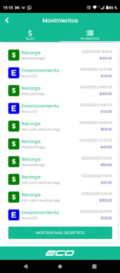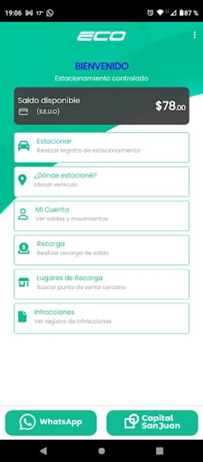 Permite realizar estacionamientos, consultar el saldo de su cuenta, recargar y ver los últimos estacionamientos realizados.