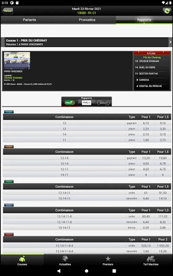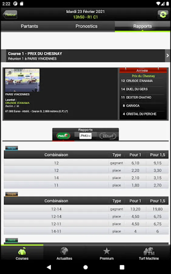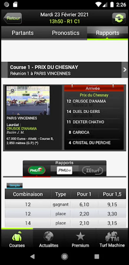 ⁃An access to the finish and PMU reports of the Quinté live from the racetracks