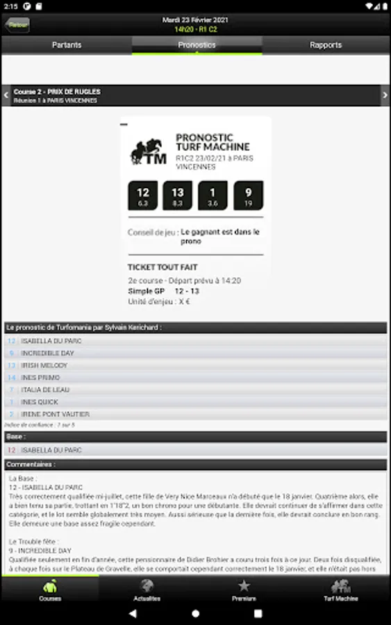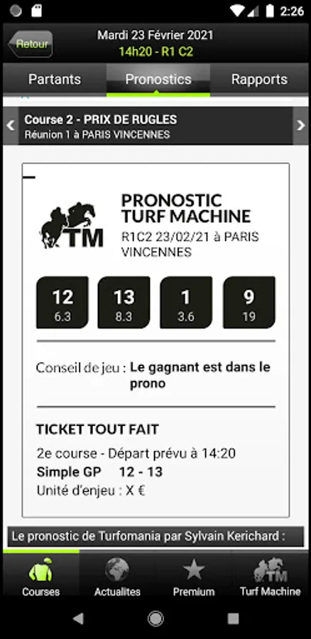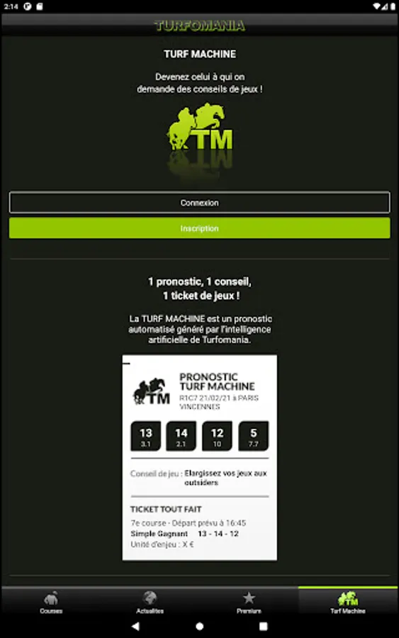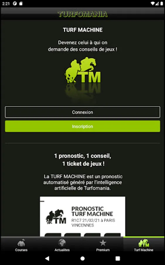 4. The Turf Machine: an automated prognosis by the Artificial Intelligence of TURFOMANIA. 1 prono in 4 horses, 1 advice depending on how difficult it will be to predict the finish of the race and 1 ready-made game ticket!