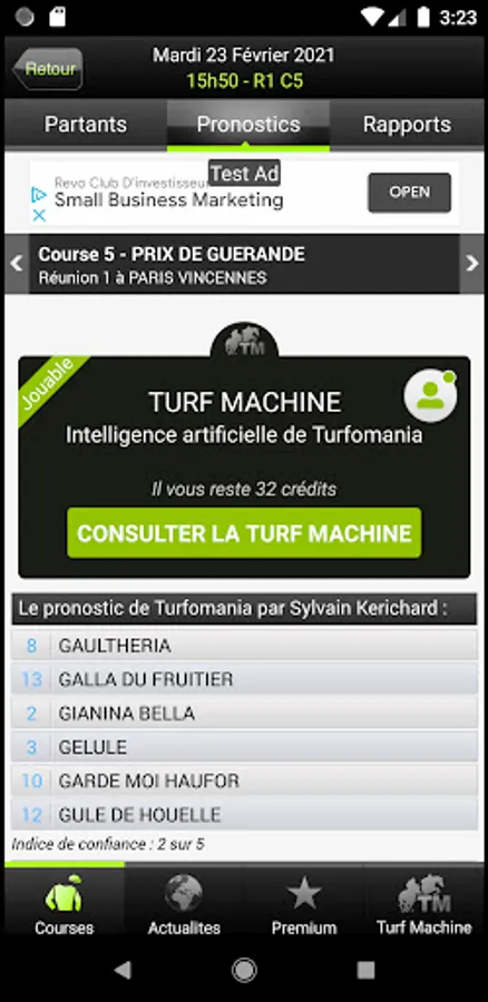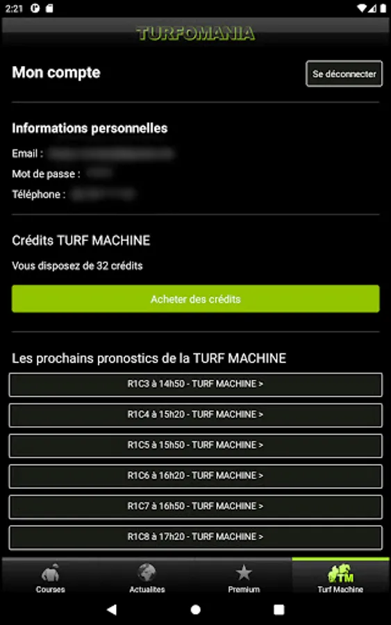 To consult the forecast of the Turf Machine, it is necessary to have a TURFOMANIA member account and a positive balance of Turf Machine credits.