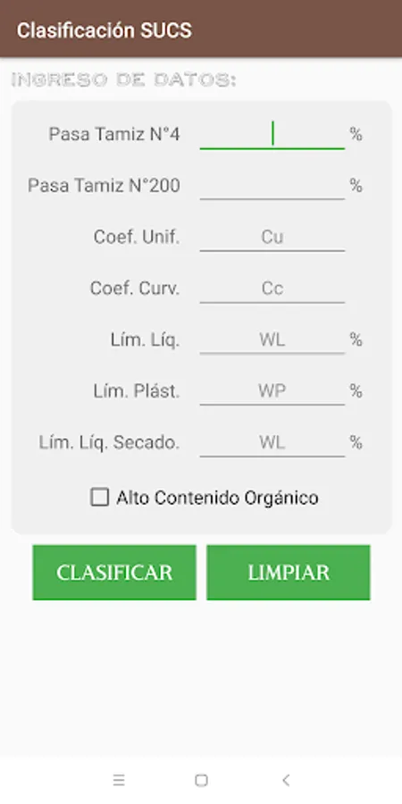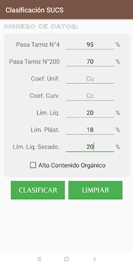 This application uses the percentage passing through the No. 4 and No. 200 sieves, the coefficient of curvature, the uniformity coefficient, the liquid limit, the plastic limit and the liquid limit dried in the kiln, to determine the symbol and the corresponding name to the type of soil.