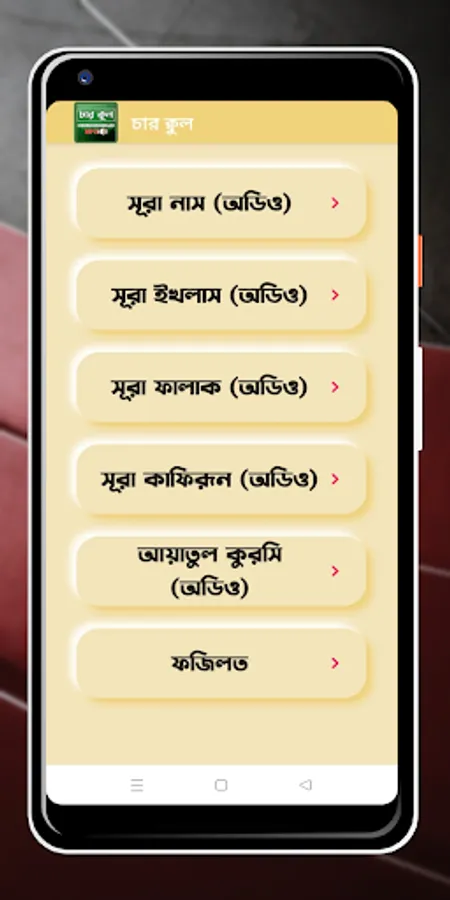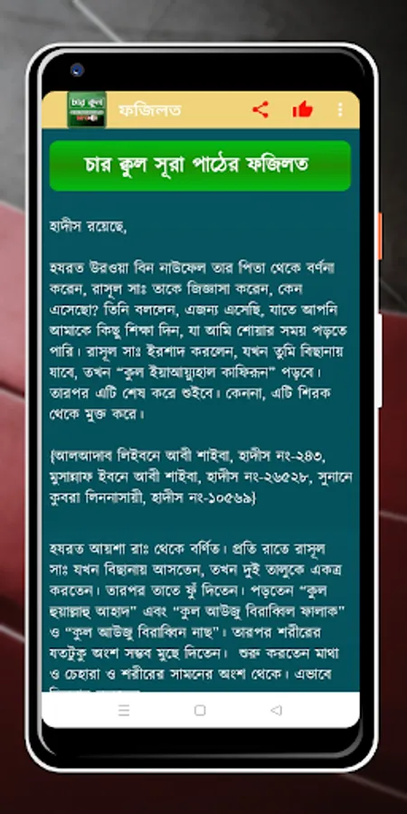 সহি হাদিস থেকে জানা যায় চার কুল হজরত মুহাম্মাদ (সাঃ) ঘুমাতে যাওয়ার আগে পড়তেন যাতে কোন শয়তান কাছে আসতে না পারে। চার কুলের অনেক ফজিলত আছে সে গুলো আমরা সুন্দর ভাবে এই অ্যাপে দিয়েছি।আপনারা অডিও সহ শুনতে পারবেন।