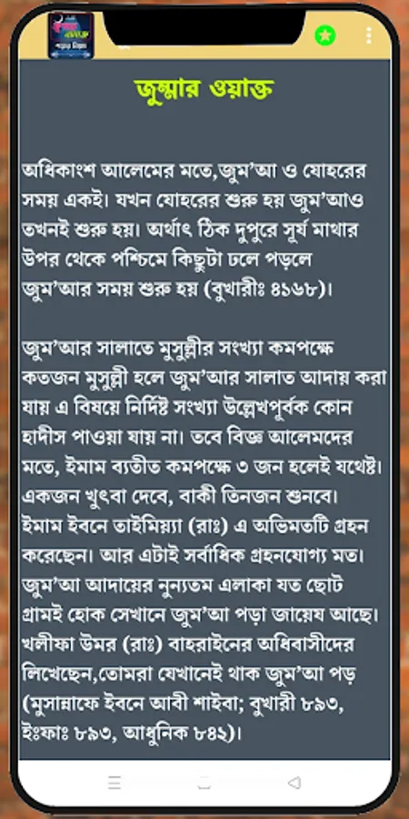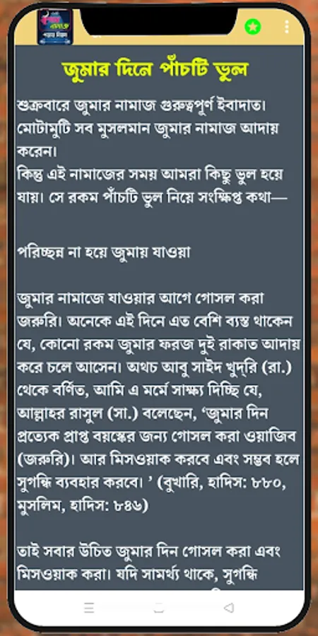 রাসুলুল্লাহ সা. ইরশাদ করেছেন, জুমা হচ্ছে শ্রেষ্ঠ দিবস। তিনি আরও বলেছেন, যে ব্যক্তি সুন্দর রূপে ওজু করা করে জুম্মার নামাজ পড়তে আসবে তার পূর্ববর্তী জুমা থেকে বর্তমান জুমা পর্যন্ত সংগঠিত গুনাহসমূহ মাফ হয়ে যায়। যে নামাজের এত ফজিলত এত গুন কিন্তু আমরা অনেকেই এ নামাজ সম্পর্কে উদাসীন। আমরা অনেকেই সঠিক ভাবে এই নামাজ আদায় করতে পারছি না,শুধু না জানার কারণে তাই এ এ্যাপটিতে জুম্মার নামাজের সম্পর্কে বিস্তারিত আলোচনা করেছি।যা থেকে সহজে জুম'আ নামাজ সম্পর্কে সবকিছু সহজে জানতে পারবেন। আমাদের ইসলামিক সম্পর্কে জানা জরুরী,