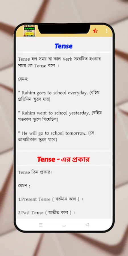 ইংরেজি শেখার প্রথম ও প্রধান ধাপ হলো Tense বা ক্রিয়ার কাল। এই Tense আয়ত্ত করতে পারলেই খুব সহজে English শেখা যায়। অনেকের কাছে শোনা যায় Tense নাকি English Grammar এর সবচেয়ে কঠিন অধ্যায় যা মনে রাখা অনেক কষ্ট সাধ্য, তাই আমরা আপনার Tense এর ভয় দূর করতে Tense এর ১২ টি গঠণ খুব সুন্দর করে তুলে ধরে কিছু শর্টকার্ট তৈরী করেছি। এছাড়া Tense এর ১২ টি গঠণ এর Shortcut formula যার মাধ্যমে ৩০ মিনিট সময় লাগবে Tense মুখস্ত করতে। এছাড়া Present Tense, Past Tense, Future Tense এর আলোকে অনেক গুলো ইংরেজি থেকে বাংলা ও বাংলা থেকে ইংরেজি অনুবাদ Translation দেওয়া হয়েছে আপনার অনুশিলন ও বাক্যে প্রয়োগ বোঝার জন্য। Tense শিখার মাধ্যমে আপনি যে কোন ইংরেজি গ্রামারে ভালো করতে পারবেন। Tense in Bangla Shortcut Formula, এবং বাংলায় Tense শিখার একটি অনন্য মাধ্যম যা আপনাকে ইংরেজী শেখাং সহযোগীতা করবে, এছাড়া পাবেন English Tense, তাছাড়া আরও পাবেন English Grammer সম্পর্ক তাহলে বিভিন্ন সময় ইংরেজী সম্পর্কে আপনারা নিজেরাই Tense Example For Grammer.গুলো শিখে লিখতে পারবেন বাক্য। আপনি বাংলায় যেভাবে কথা বলেন ঠিক তেমনি Tense মাধ্যম বাংলা বাক্য গুলো সহজে ইংরেজীতে রূপান্তর করতে পারবেন। Spoken English is most important to learn Tense. so you can learn Tense then speak English.