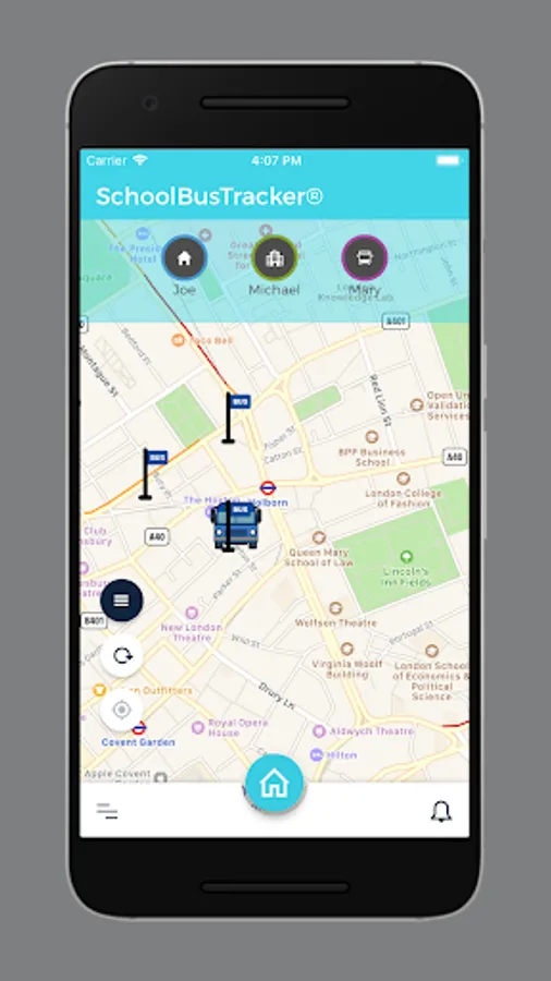 Mobile parent app part of a unique school transport software suite. Advanced parent notifications of bus departure and arrival time at the school as well as full tracking of the bus route.