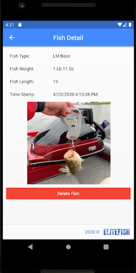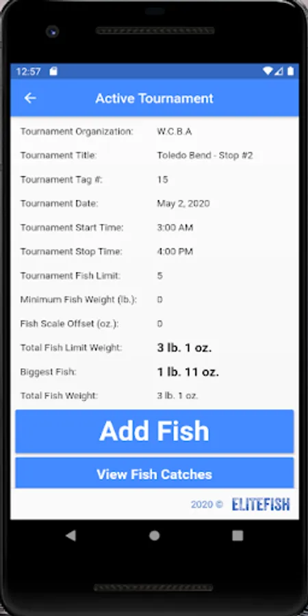 EliteFish Tournament Pro is a “Major League Fishing” style fishing tournament app that captures photos, logs weights, length of fish, etc. for the purpose of eliminating cumbersome weigh-ins at the end of fishing tournaments.