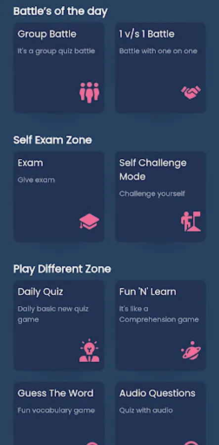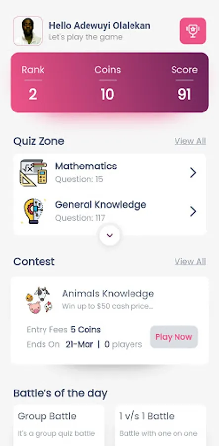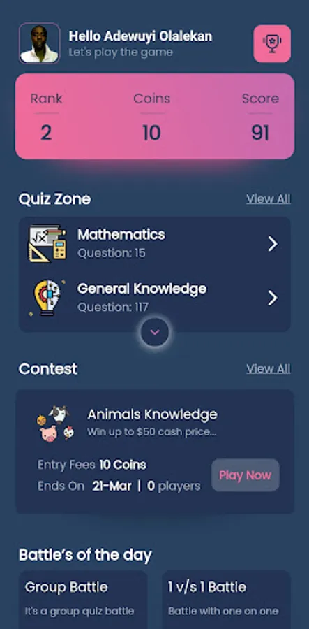 Elite Games is an interesting educational game app with different activities like: Battle Quize where users can compete against others and win coins. There are three different types of battles available in the app: Random battle, One-to-One, and Group Battle Quiz. Other game activities include: Guess The Word, FUN ‘N’ LEARN, Self Challenge, True & False, Daily Contest. Etc.