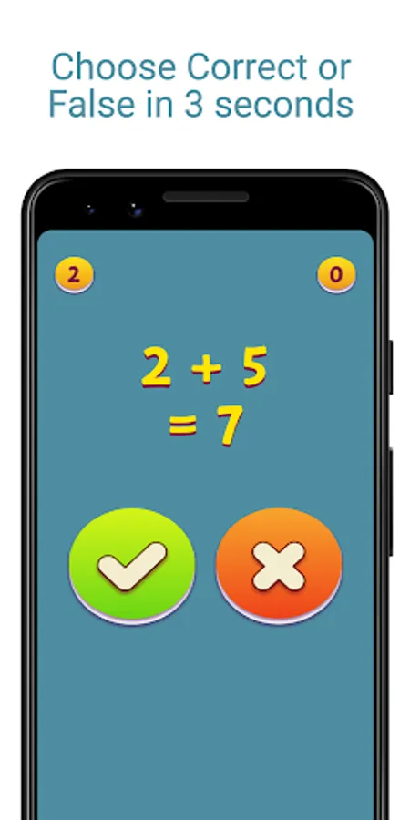 A simple mathematical calculation game that helps you to test and develop skills required to quickly solve examples in mind. There is no level in the math game. You have to calculate two given numbers and decide if the answer is correct or wrong. Three seconds is given for every question. Every time three seconds is over or you clicked on the wrong button, the game ends. After answering thirty questions, two seconds is given for every question, and after answering sixty questions, one second is given for every question.