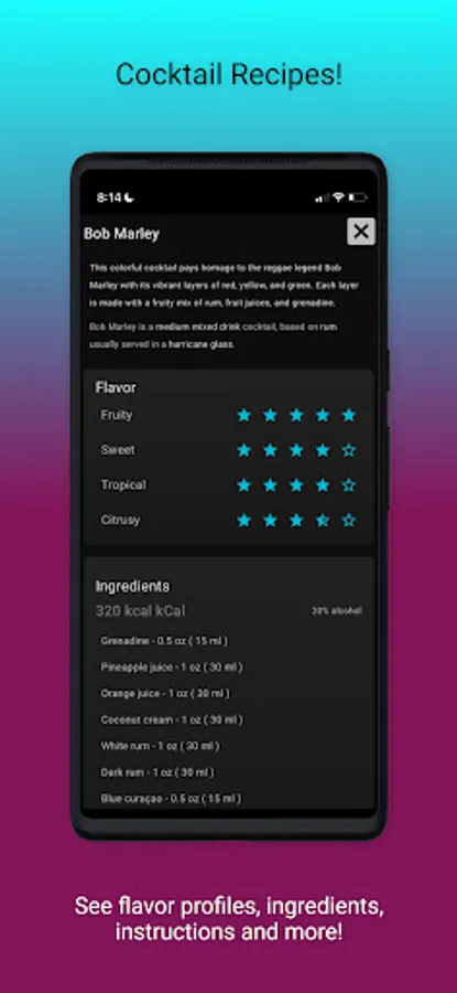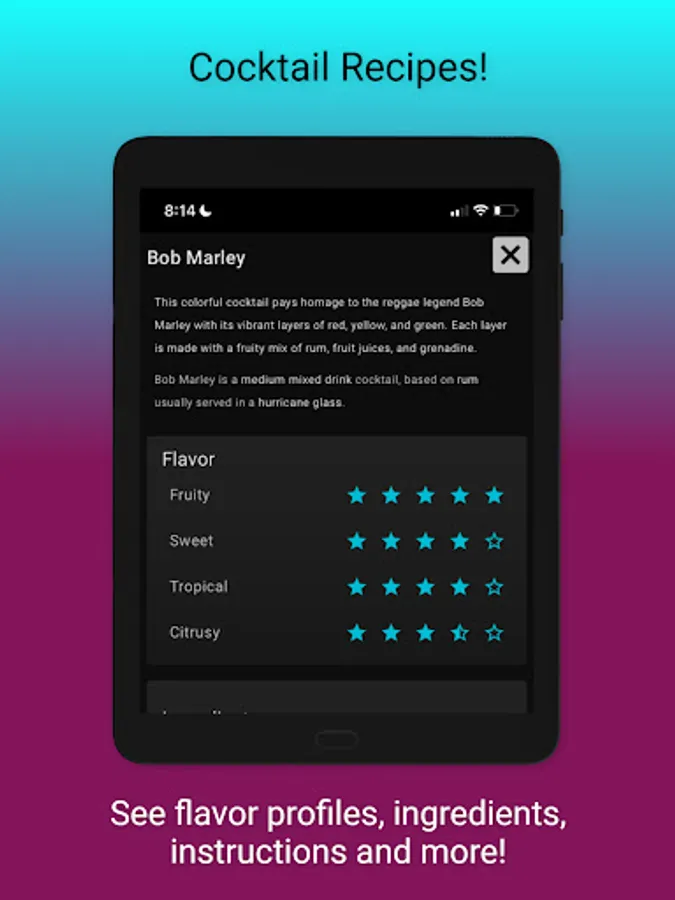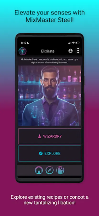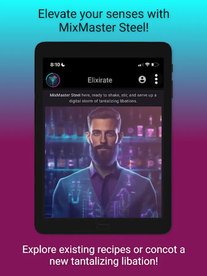 Meet Elixirate, your personal virtual bartender! Discover a world of cocktail recipes or create your own with ease. Our unique AI, MixMaster Steel, crafts custom cocktails tailored to your taste. Whether you're a cocktail enthusiast or a curious beginner, Elixirate is your go-to app for mixing drinks. Enjoy the art of mixology right at your fingertips!