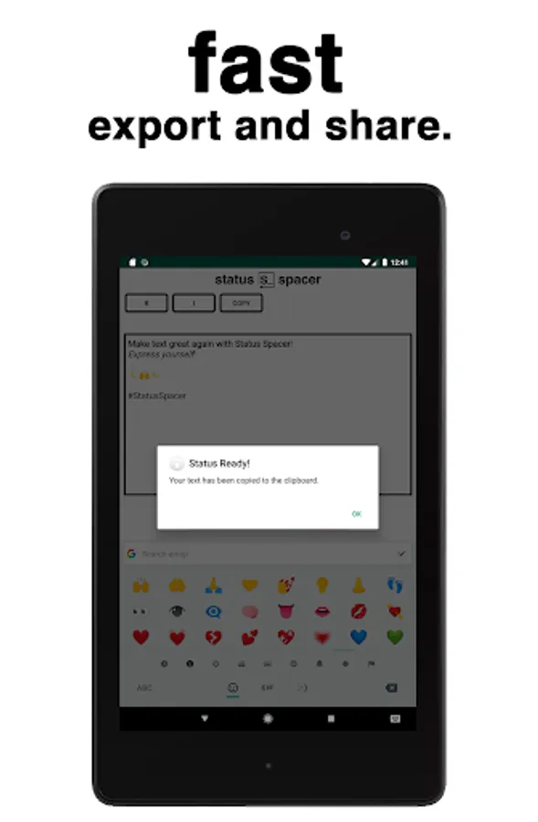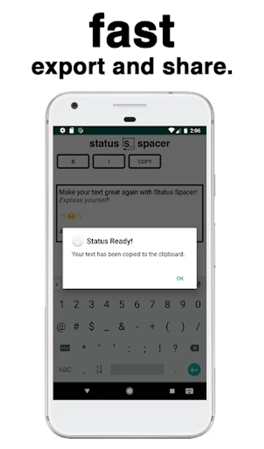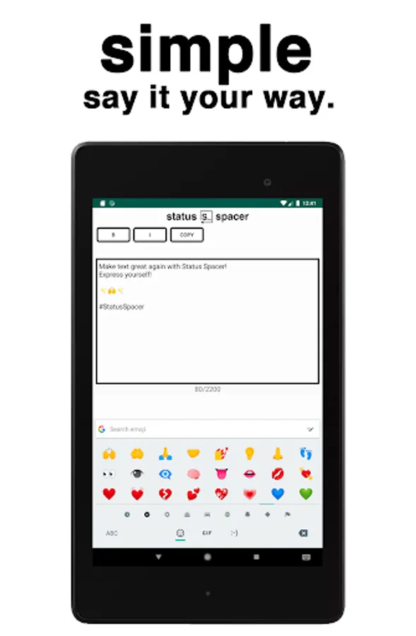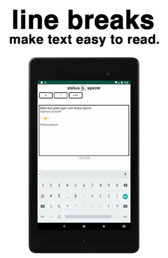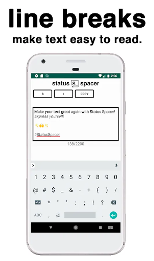 Simple and fast line breaks at your fingertips. No more blocks of text.No ugly dashes. Bold? Italics? Yup. Easily export text to your favorite photo-sharing app. *wink* Type your status, spaces, emojis, and all. Bold and italicize whatever you want by simply highlighting it. Don’t forget your hashtags! Hit COPY and the app will automatically open IG for you. Choose your image and then PASTE the status into the text field. All of your fancy-schmancy words will appear just as you typed them out in Status Spacer.