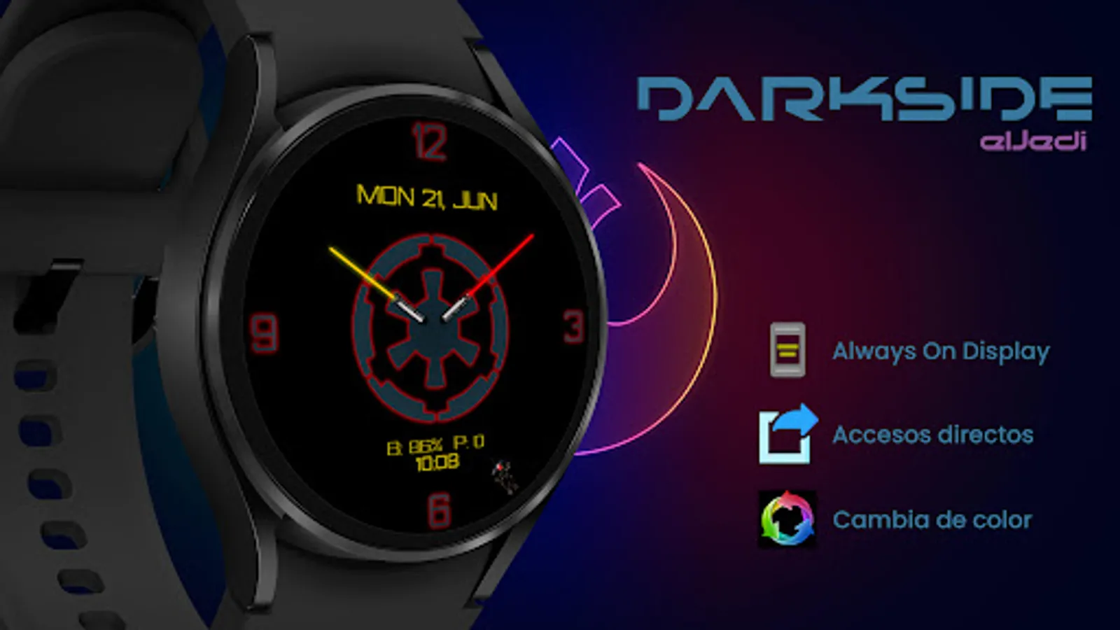 Dark Side Watchface with AOD, Color Change and Wear Os Shortcuts.