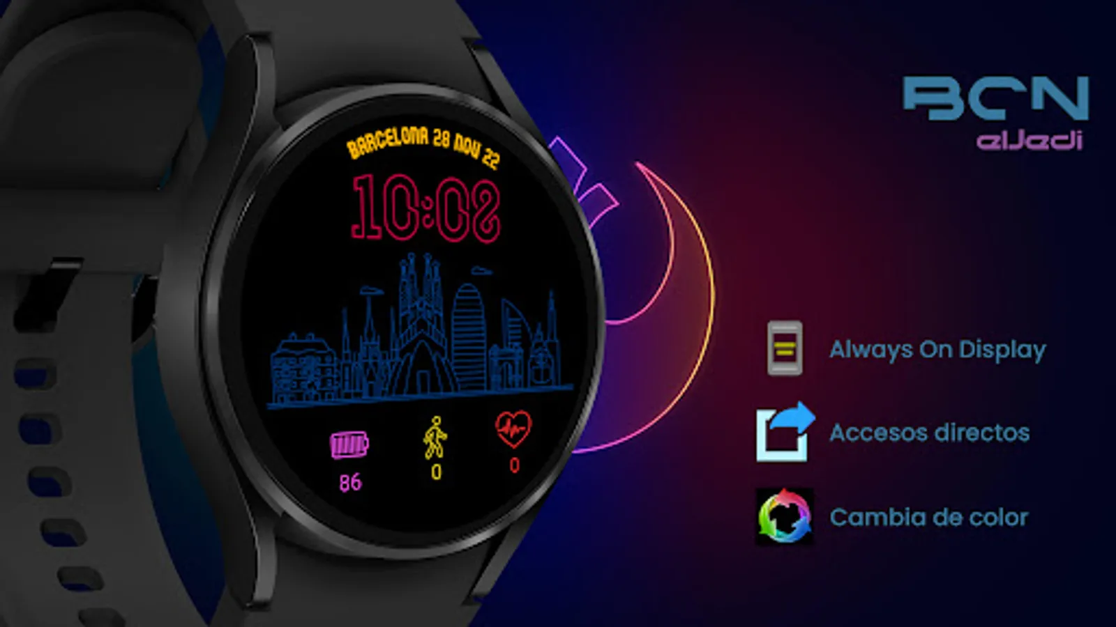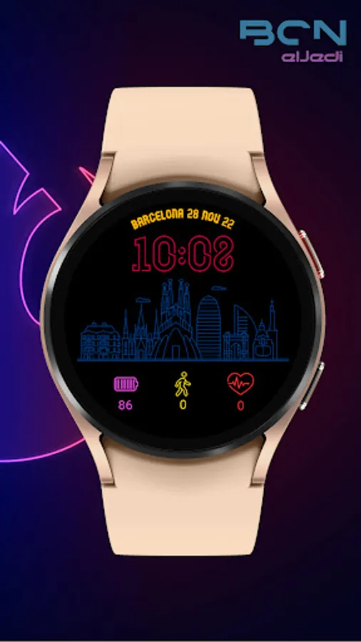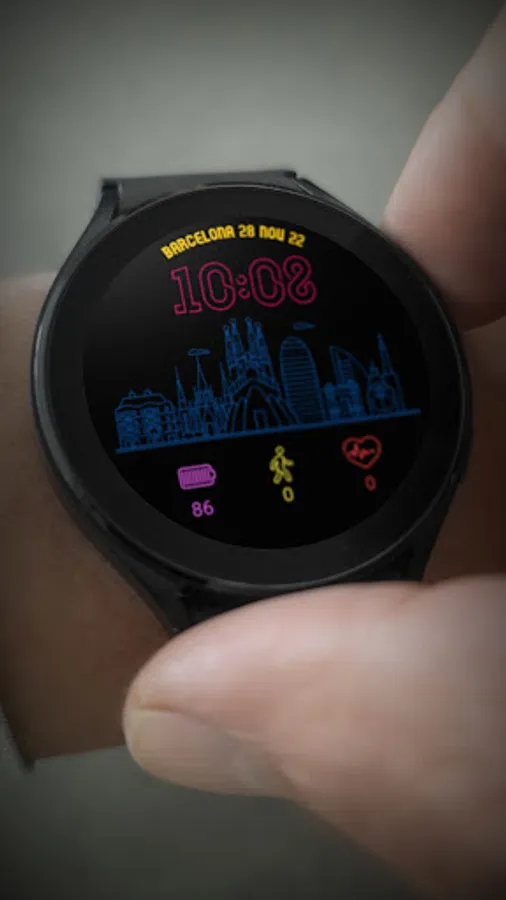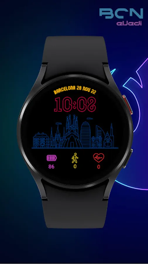 Digital watchface inspired by the city of Barcelona Spain. NEON Collection for Wear Os