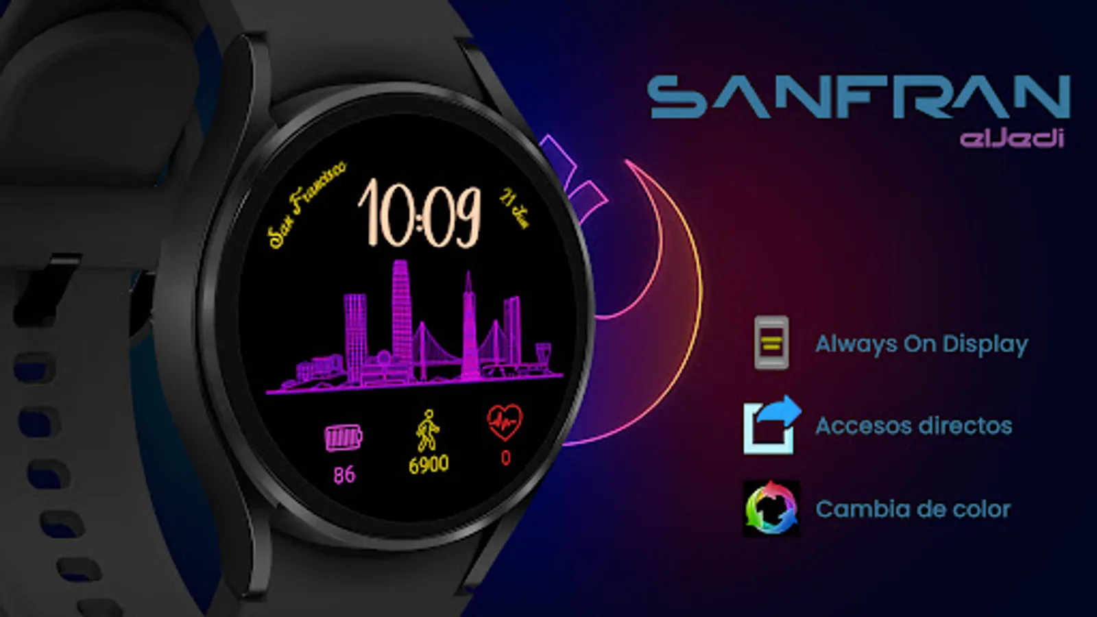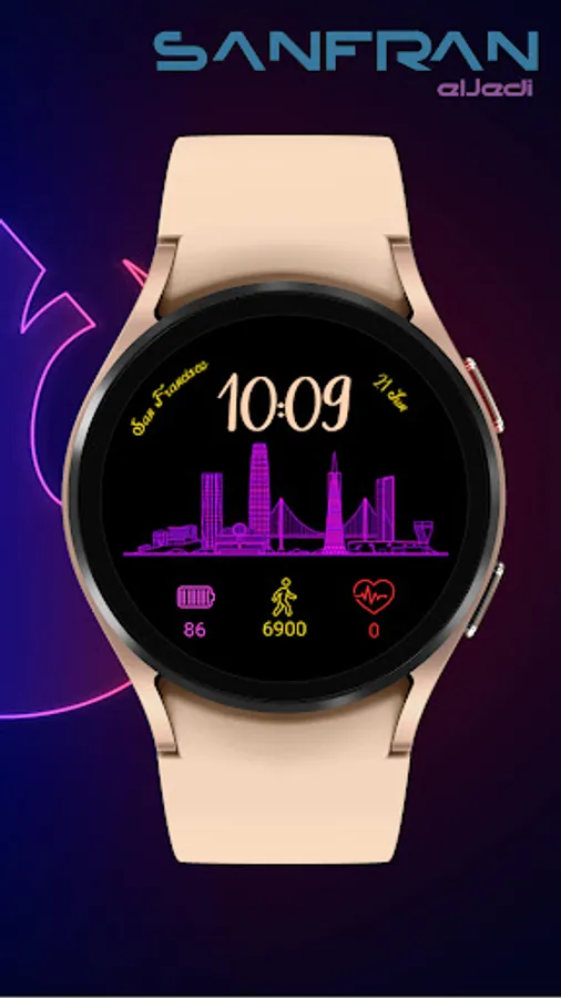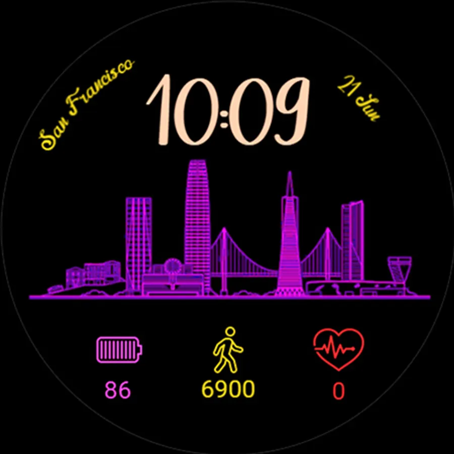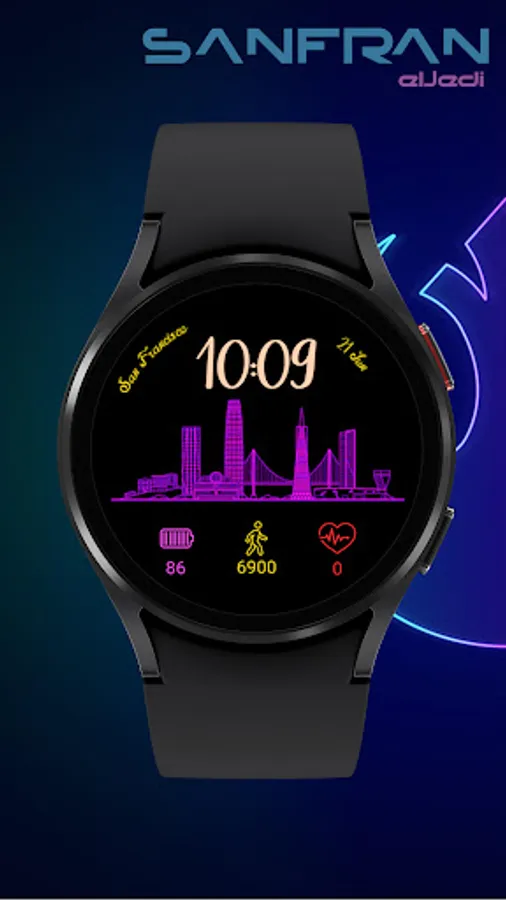 San Francisco inspired digital watch face for Wear Os. shortcuts, AOD and color change. neon collection