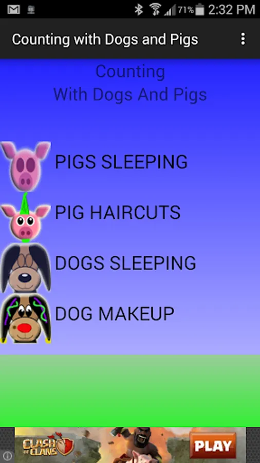 - Cute, kid-friendly graphics of pigs sleeping, dogs sleeping, funny dogs with makeup, and silly pigs with green hair.