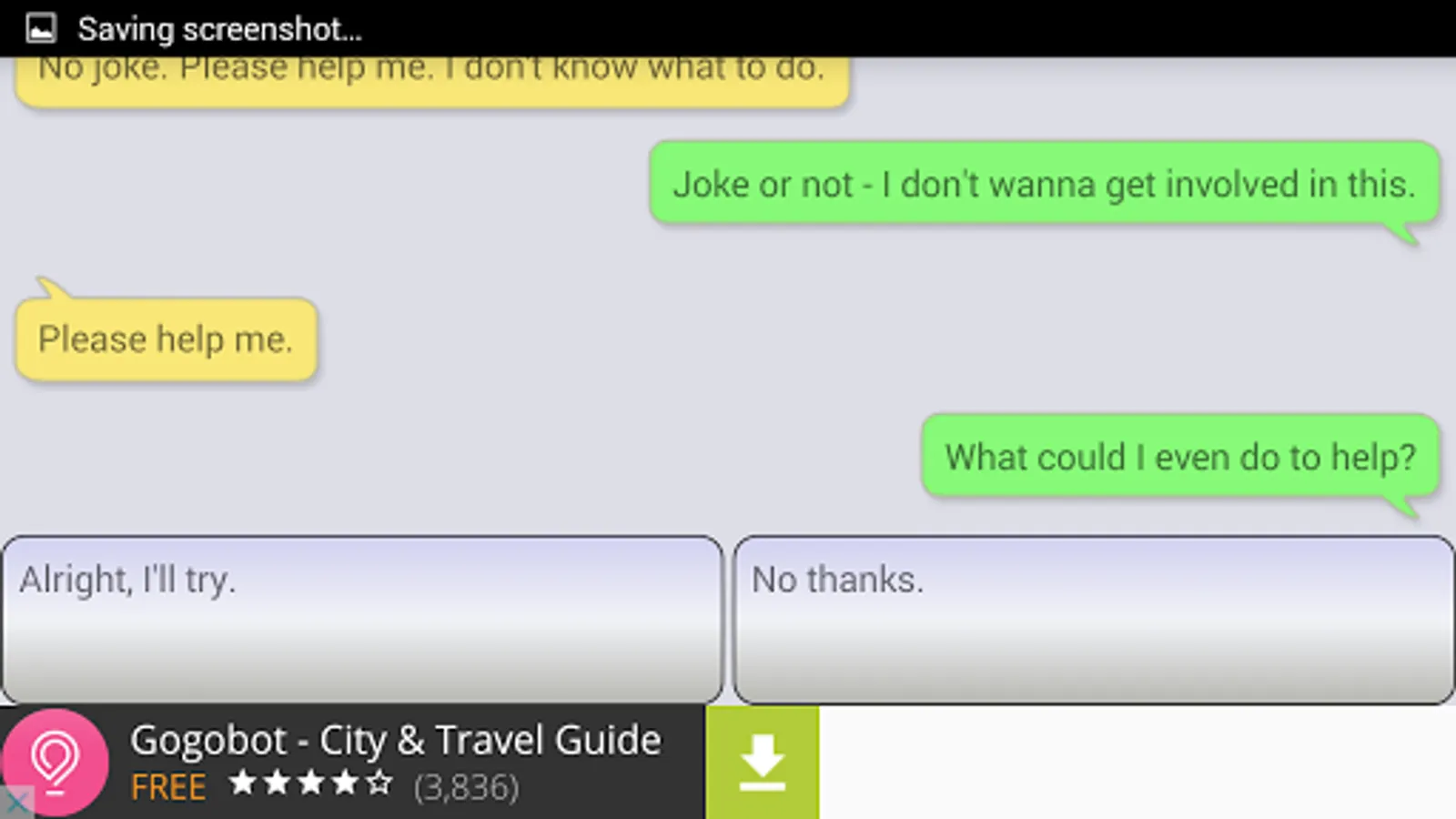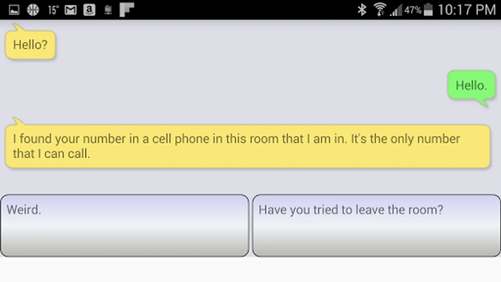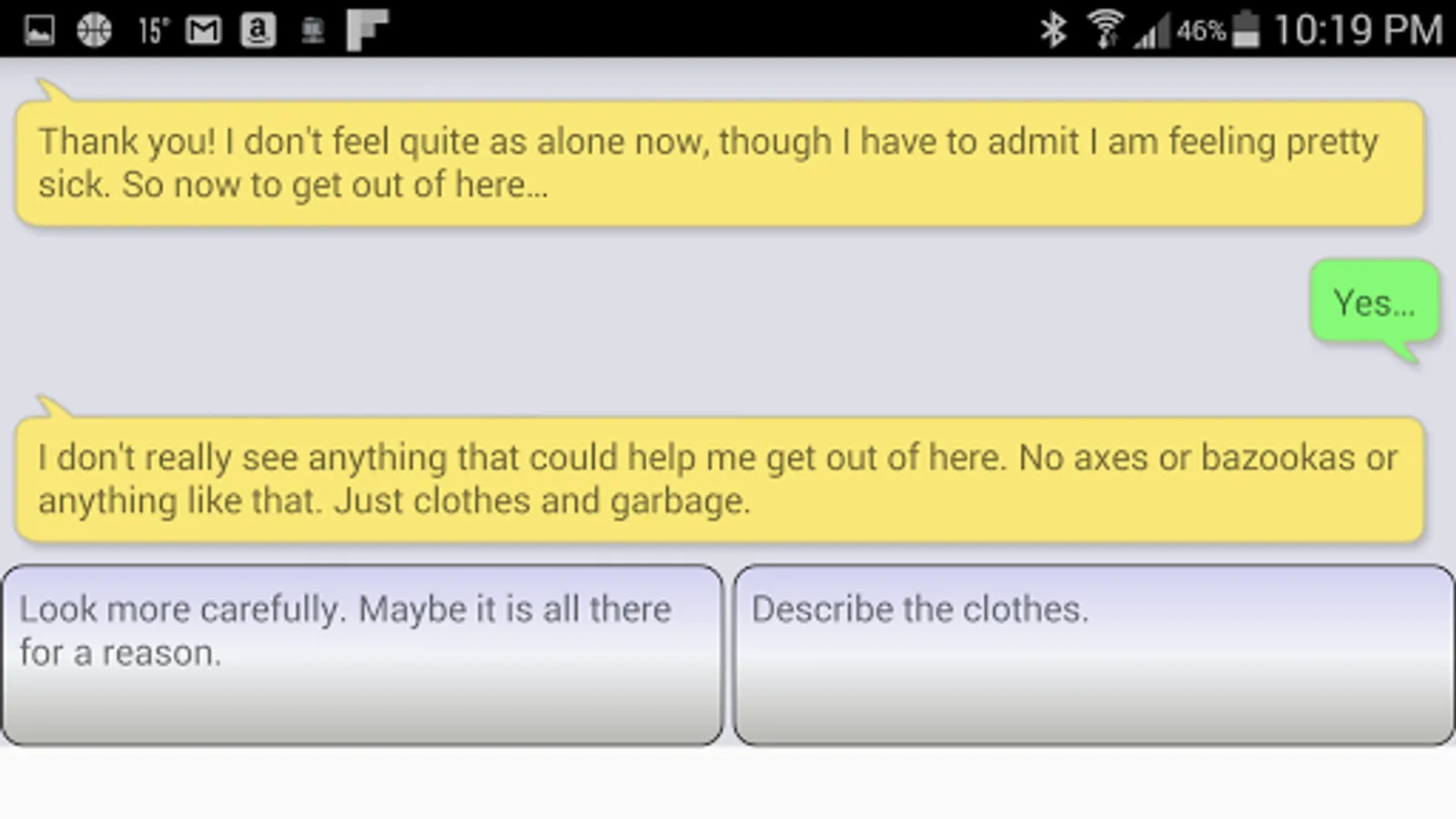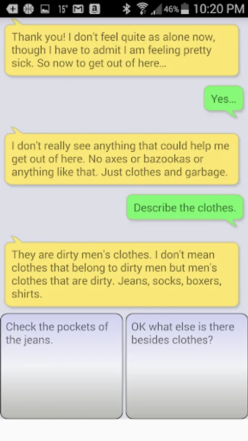 Help Jim is a text adventure game. It is a playable, branching story where your responses determine what happens next. Do your best to help Jim and he just might escape. The style of the game mimics a text messaging app. The story can be completed through multiple paths, so it warrants multiple replays. It is like an electronic "choose your own adventure" game.