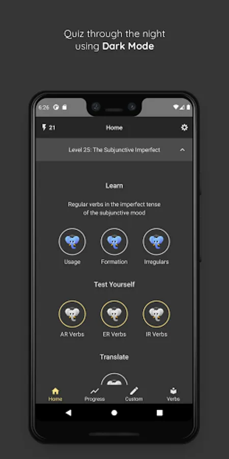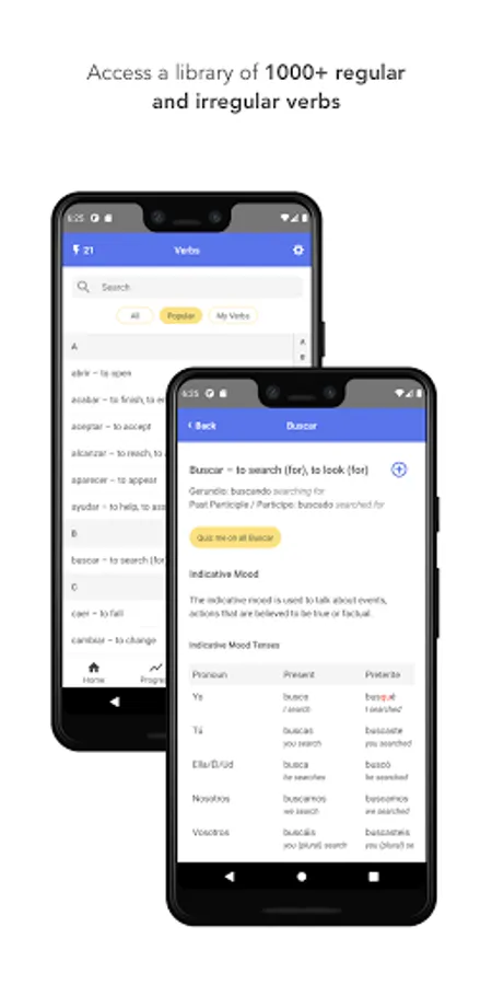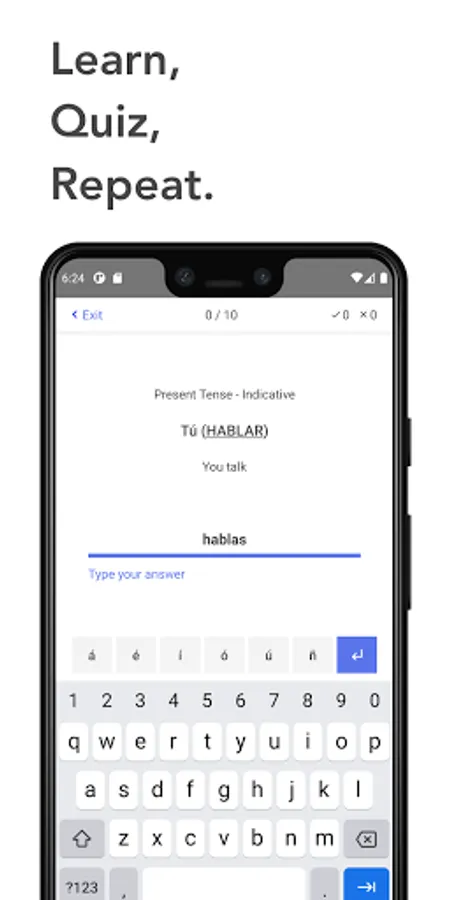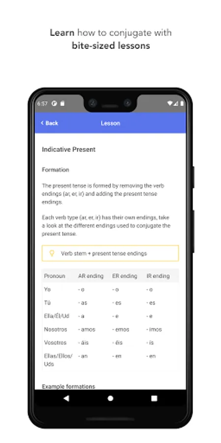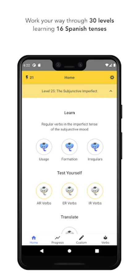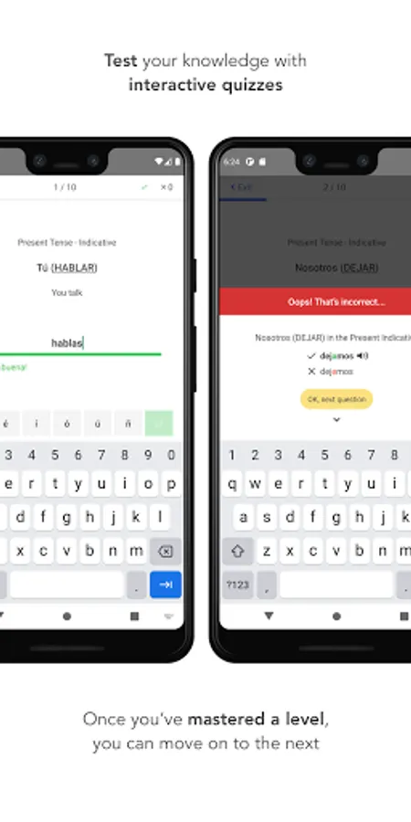* 30 levels (6 for free) with bite-sized lessons and Spanish conjugation quizzes, guiding you through 16 tenses to master Spanish verb conjugation.