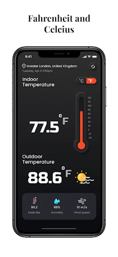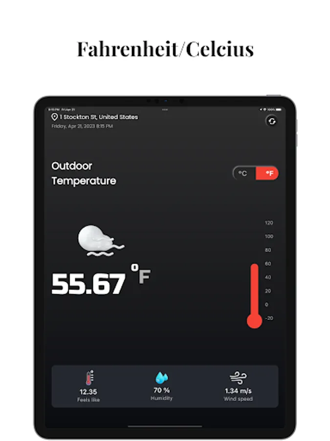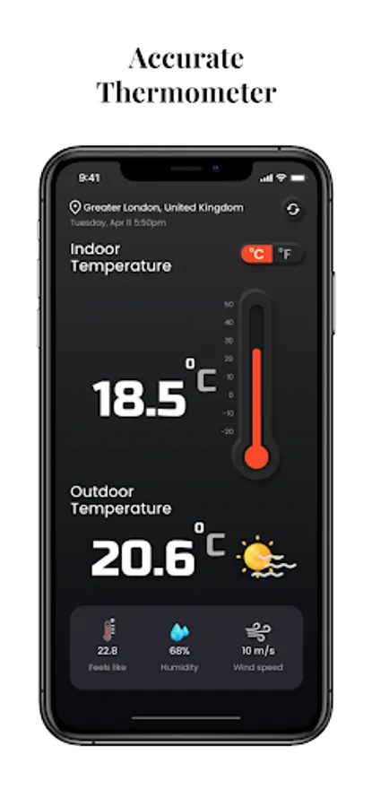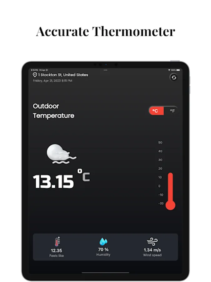 Ultra Accurate Thermometer 1000° is the original and top selling application that turns your Android into a thermometer. This application will tell you the exact outside temperature based on your current location (GPS or WiFi). An animation will show you the current outdoor temperature on an stylish Design.
