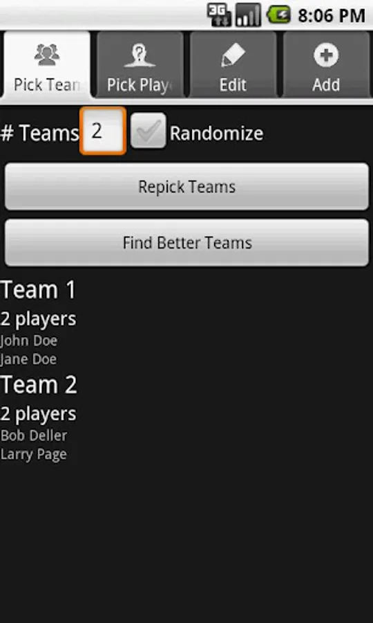 The algorithms used are quick and efficient, and produced fairly balanced teams based on the skill ratings. It takes only a few seconds to add a player to the database, and only a few seconds more to un-select players not present.