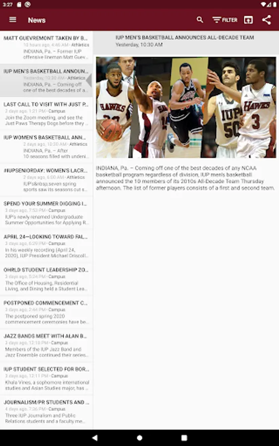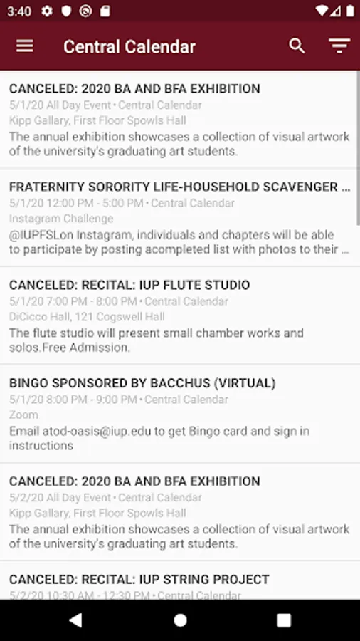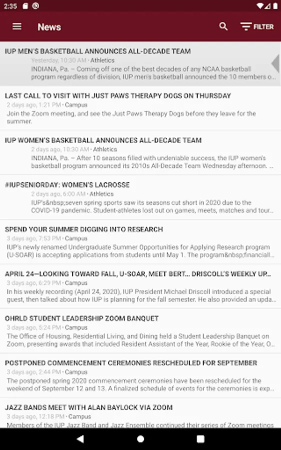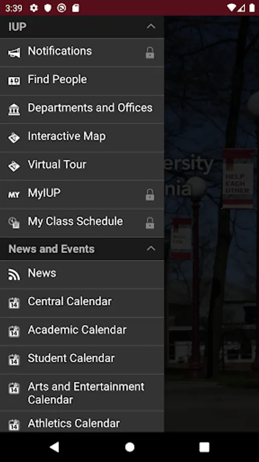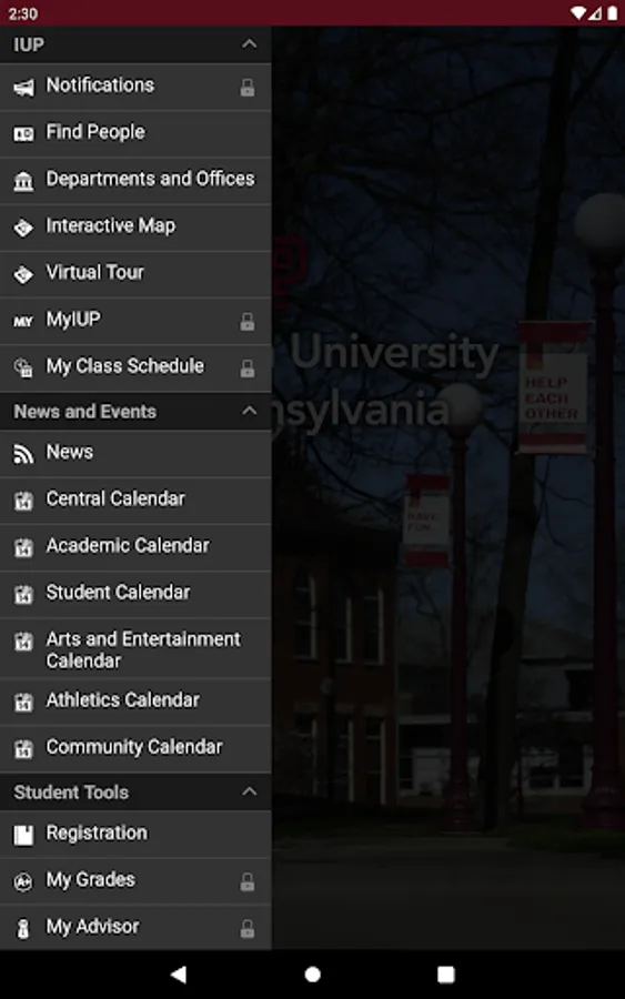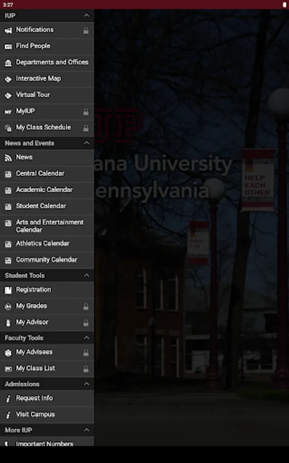 Log in with your IUP Network ID—the same as MyIUP—to access your schedule, your grades, the campus Find People directory, a calendar of university events, push notifications, an interactive map, MyIUP integration, coverage of athletic events, links to IUP on YouTube and LinkedIn, and more.