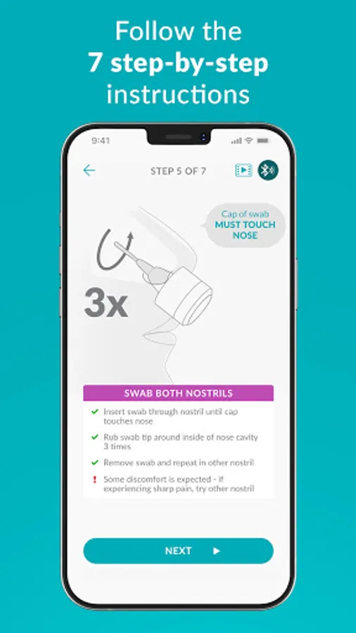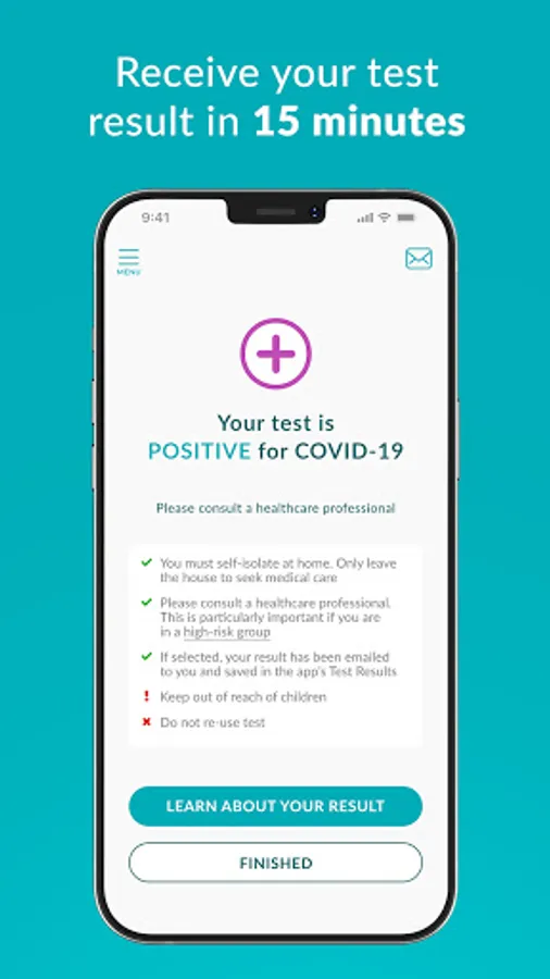The Ellume COVID-19 Home Test App guides you step-by-step through using the COVID-19 Home Test kit (purchased separately). It will help you understand your result, know what steps to take next, and allow you to share your test result with your healthcare professional or employer.