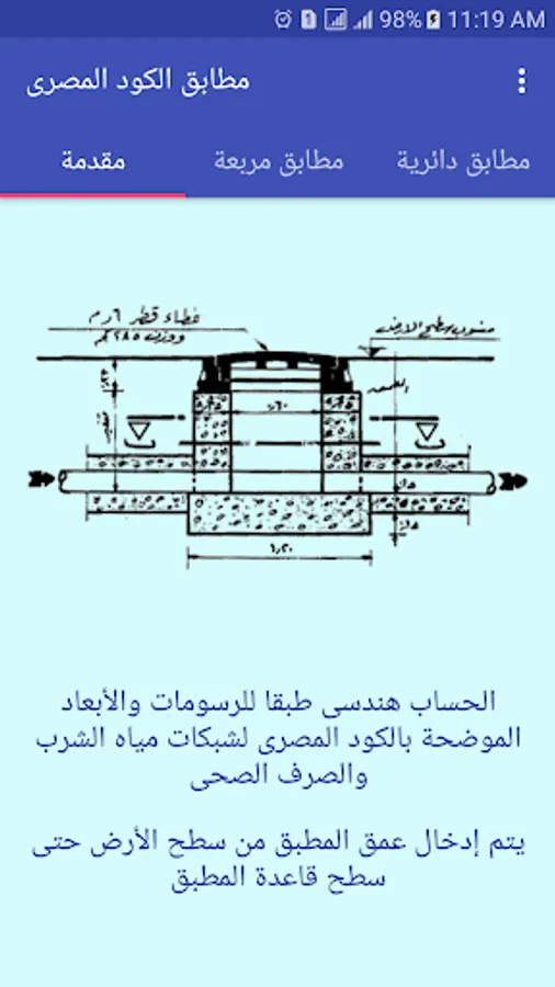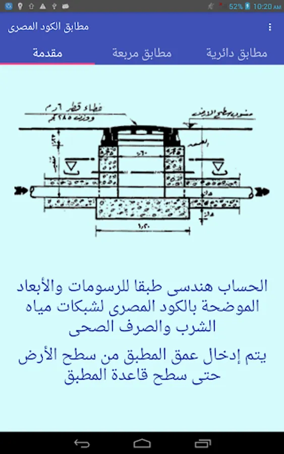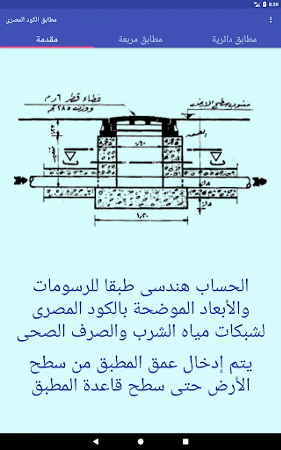 للمطابق الدائرية والمربعة طبقاً لنماذج الكود المصرى لتصميم وتنفيذ خطوط المواسير لشبكات مياه الشرب والصرف الصحى
