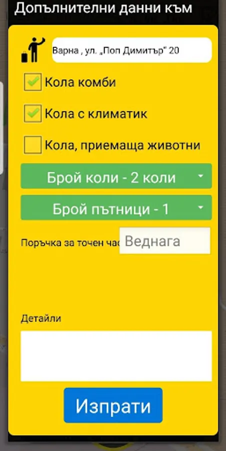 You only order two-button taxi !!! Your order is accepted and processed by our dispatchers, then you see what your tax is, where it is in the coin, how long it will be with you and how it comes to you. When you place your order, you can choose different requirements such as: the car travels through a dirt road, carries a luggage, has a luggage compartment or wagon, and a bunch of others. You can also write directly to our dispatchers through our chat system in real time.