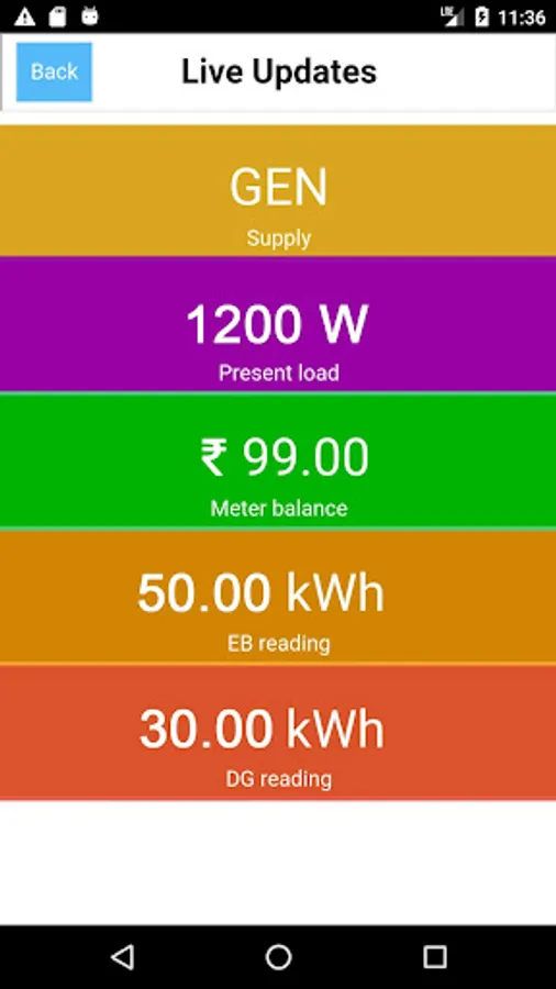 In this module use can view all the current electricity data. User can see the supply mode either grid or DG, Present load (Watts), Meter balance, EB reading,DG reading.
