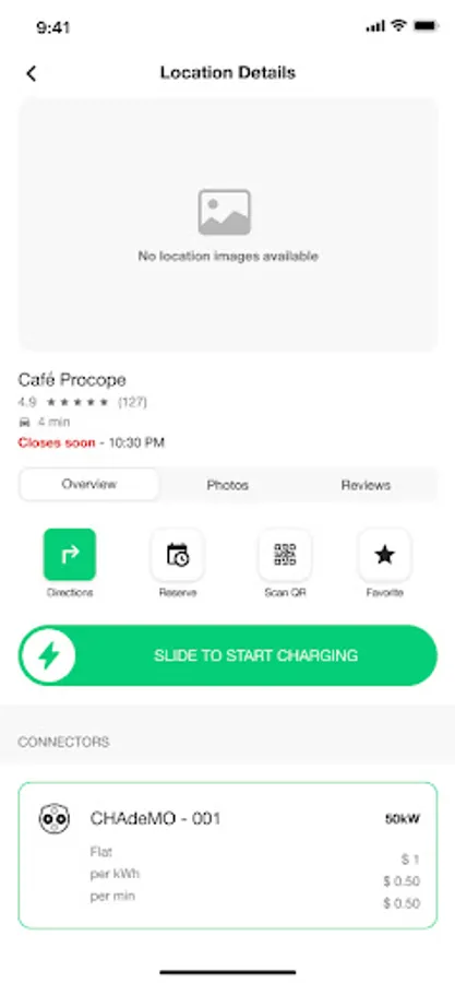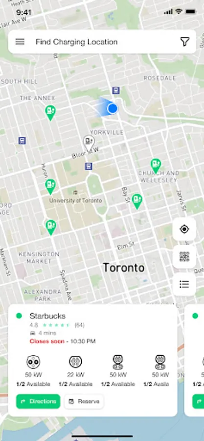 Quickly identify all available charging locations, that support your connector type, near to your current location.