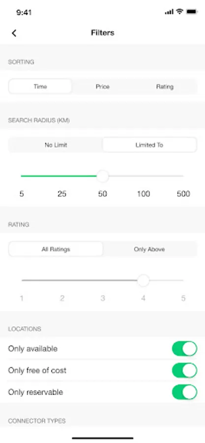 Filter out charging locations based on distance, rating, connector type, location availability/free of cost/reservable, and amenities.