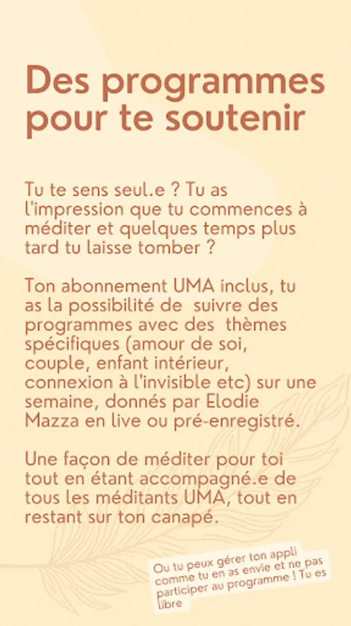UMA is an artisanal meditation application, it aims to be natural, simple and sincere. Whether you are a beginner or advanced, it is usable for all ages and all levels. Elodie Mazza started meditation at the age of 9, she has since experienced many ways of being introspective. His experience led him in 2016 to create meditation evenings. She accompanies hundreds of people each year to tame their Silence, to become familiar with their spiritual part and to accept what presents itself. UMA means in Sanskrit: Splendor, Light and Serenity. She advocates simplicity, joy and well-being to learn to love yourself as you are and not as you think you should be. You will find programs allowing you to follow meditations with specific themes, live with Elodie Mazza.