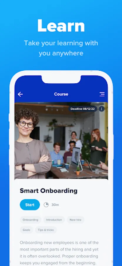 The app is built to support you in onboarding new hires, ensuring your organization is compliant and secure, or even getting your sales teams trained and up to speed to deliver on expectations.