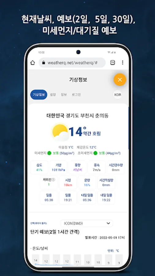 WeatherQ (WeatherQ) provides free access to global weather and air quality information anytime, anywhere without a separate membership or registration process. Users can search for the current location or desired location, and the current weather and weather forecast (2-day forecast//5-day forecast/30-day forecast), fine dust forecast (PM2.5/PM10), and air pollutant forecast (No2/O3/SO2) /CO) can be checked.